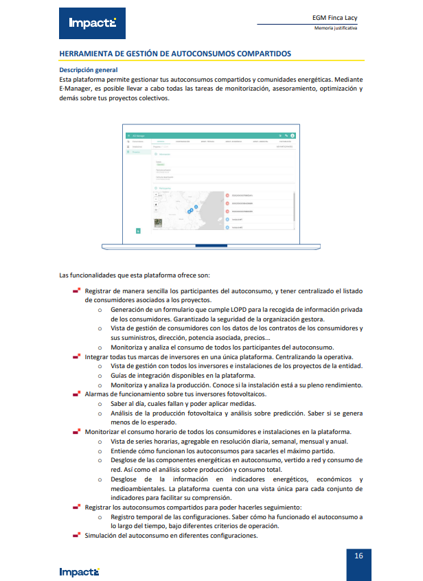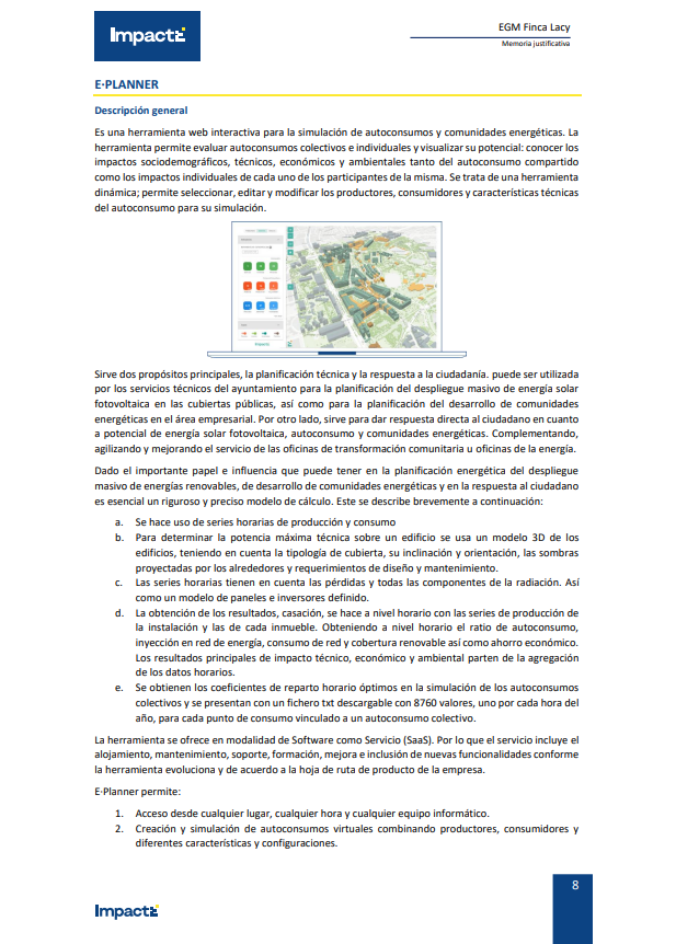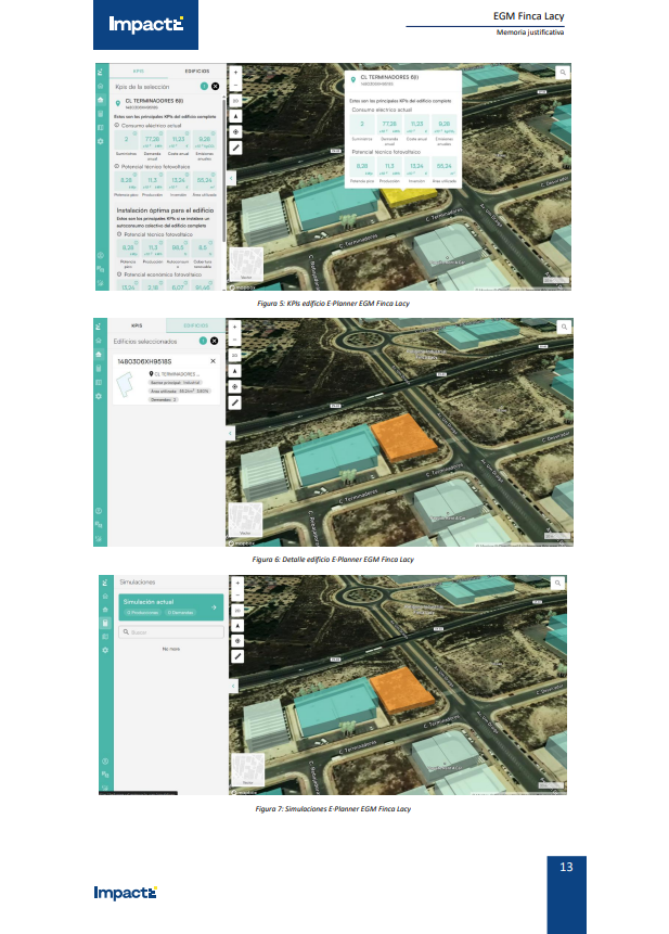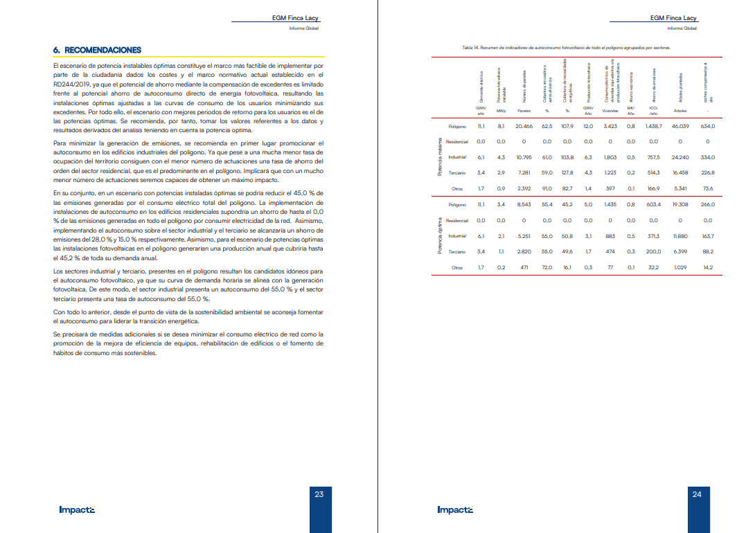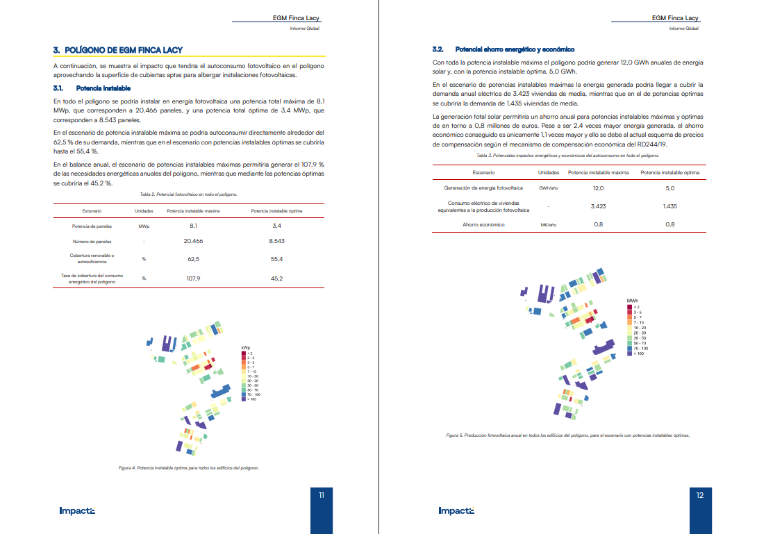 En conjunto, el Informe Global ofrece una hoja de ruta técnica para orientar las inversiones en autoconsumo fotovoltaico, optimizar el aprovechamiento de las cubiertas y maximizar el impacto energético, económico y ambiental de las actuaciones en la EGM Finca Lacy.
